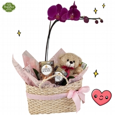 Orquídea Pequena Pink, Tabletes Ferrero e Ursinho na Bolsa de Palha