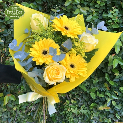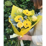 Buquê Charminho com flores amarelas: gérberas, rosas e com folhagens de eucalipto e tango.