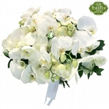 Buquê de noiva de orquídeas phaleonopsis, rosas, astromélias e outras flores nobres brancas, com laço de cetim.