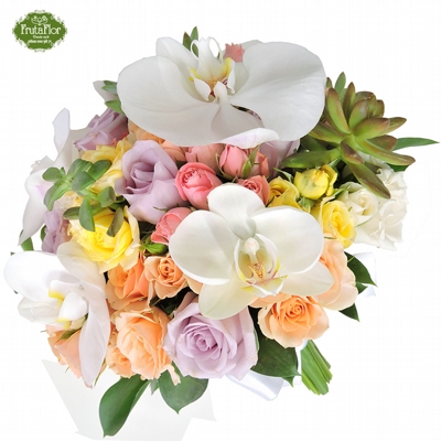 Buquê de noiva de orquídeas brancas, rosas finas e mini rosas coloridas. Com toques de suculentas