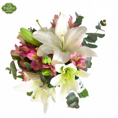 Buquê de noiva de lírios brancos, astromélías cor rosa e eucaliptos. Com entrelaçado de cetim.