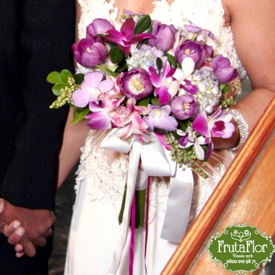Buquê de noiva com tulipas, orquídeas e outras flores nobres.