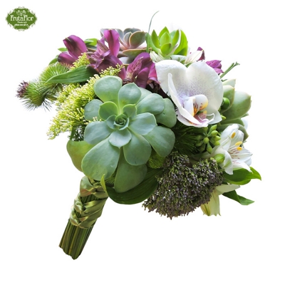 Buquê de noiva com suculentas, orquídeas, astromélias e outros complementos em tons de verde e vinho.Com laço de cetim.