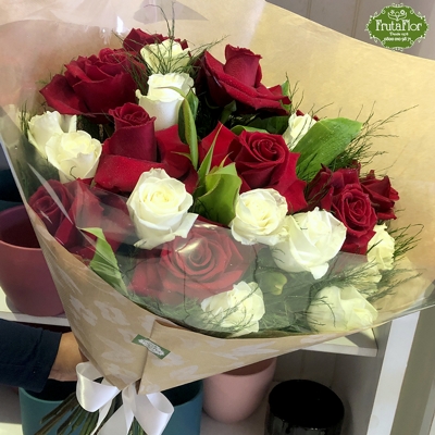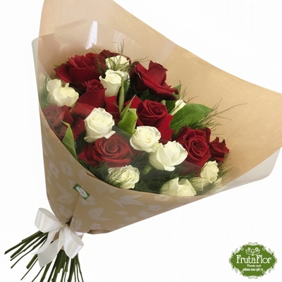 • Composição: 10 Rosas colombianas vermelhas, 10 rosas nacionais brancas e complementos de folhagens ornamentais.