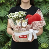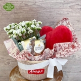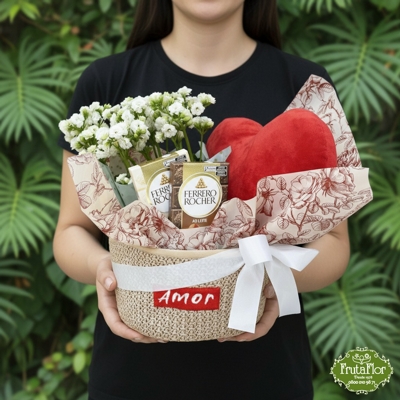 Cesta amor com coração de pelúcia, uma kalandiva plantada, pequena, embalada para presente, com aproximadamente 25cm de altura e dois tabletes de chocolates da Ferrero Rocher 90g sortidos.