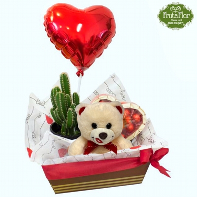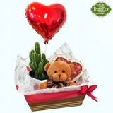 Cacto plantado embalado para presente e balão metalizado com formato de coração.