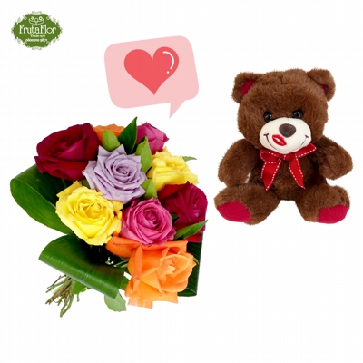 Buquê surpresa de rosas coloridas, com aproximadamente 40cm de comprimento, embalado para presente, com um ursinho de pelúcia fofinha.